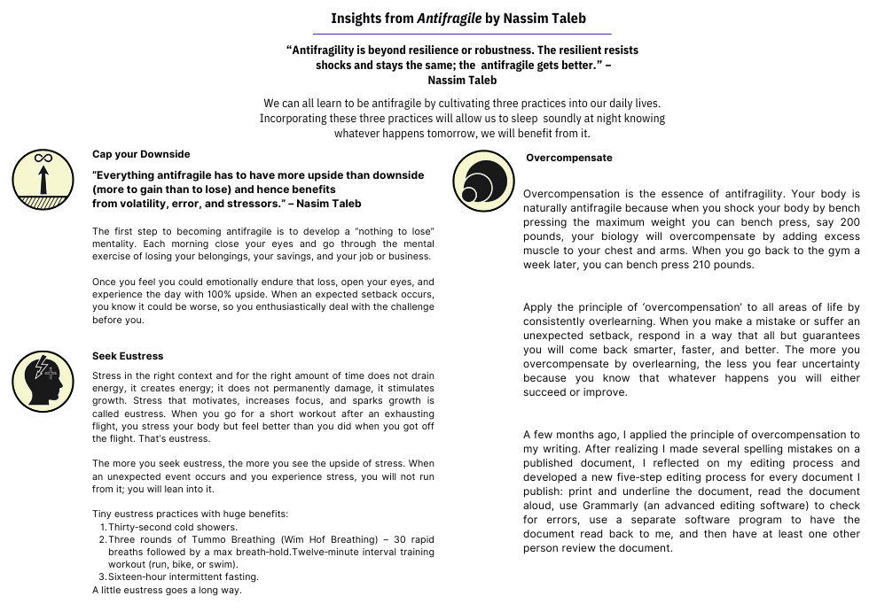 • Cultivating practices of antifragility can lead to a mindset where one benefits from adversity.